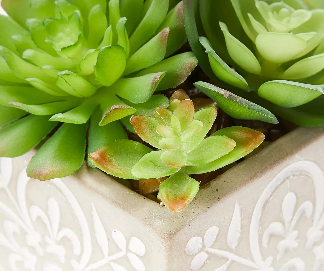 Beautify your home with the help of this stunning artificial succulent plant. Resting in a pretty white square cement pot with an eye-catching floral pattern, this artificial succulent is sure to bring a serene atmosphere to any space. The perfect piece of décor to add that extra bit of charm to your living room, bedroom, dining room and more!