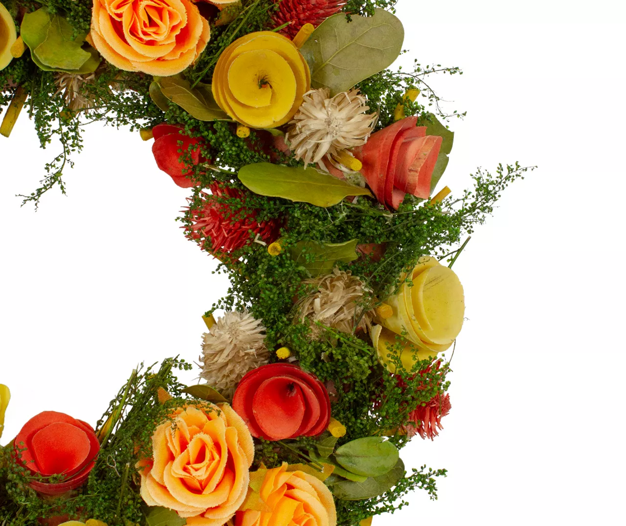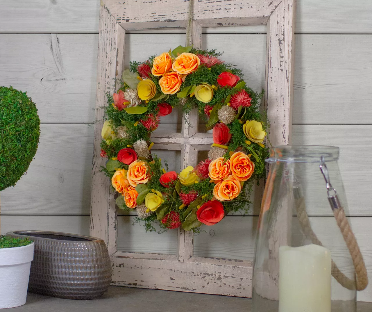 With spring right around the corner, this adorable wreath is the perfect way to welcome in the new season. This wreath with peach, orange, yellow and white flowers is mixed with realistic moss, bringing a bit of holiday cheer wherever you go. This wreath brings wonderful springtime sentiments to your living room, entryway or kitchen.