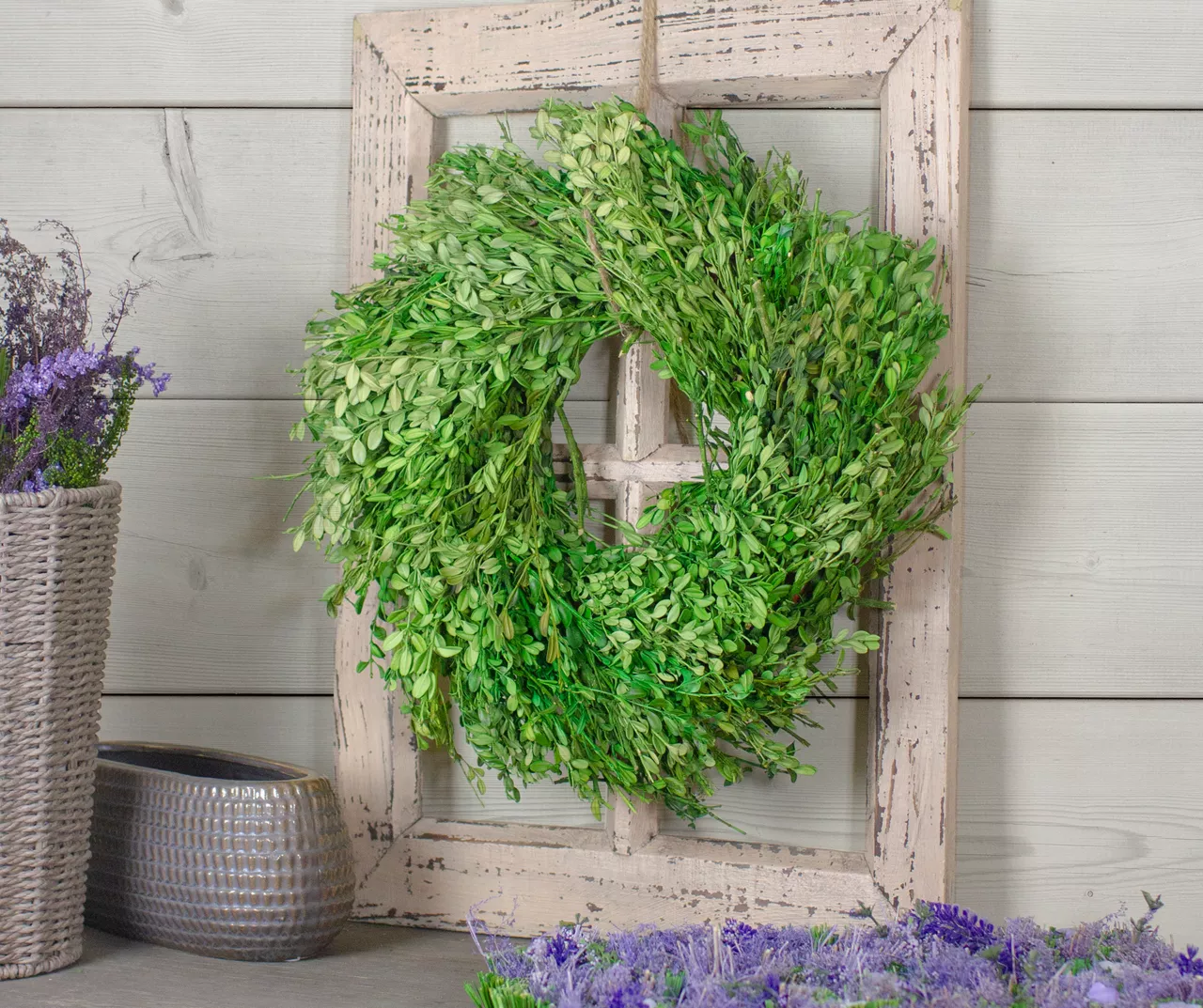 With spring right around the corner, this adorable unique wreath is the perfect way to welcome in the new season. It’s beautifully constructed of green foliage that spirals around in a round shape for visual interest. This wreath is a stunning seasonal addition to a living space, entryway or kitchen.