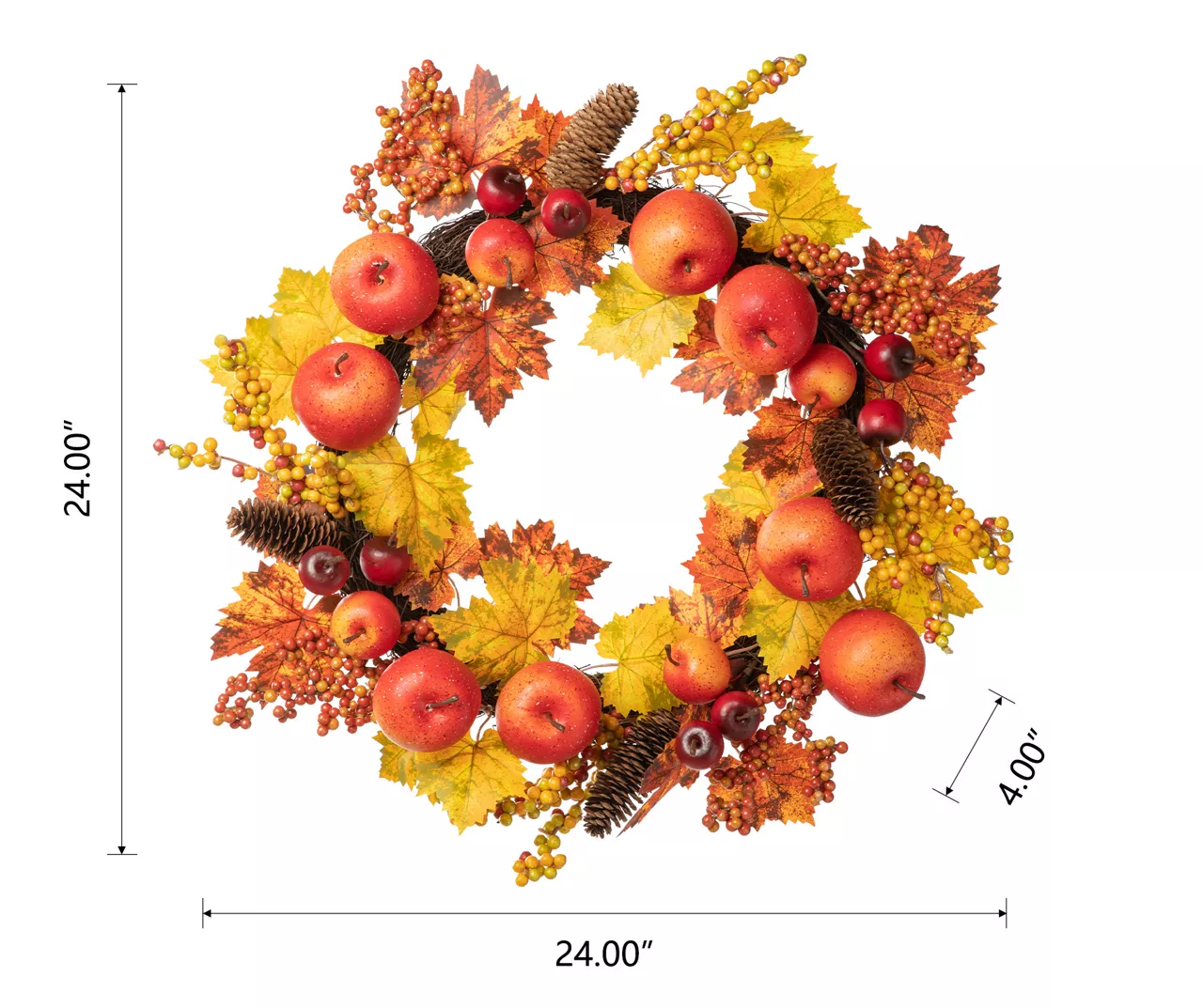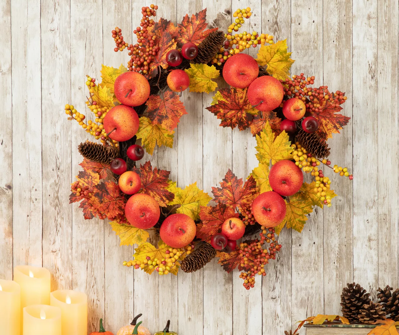 This wreath is beautifully accented with a mix of realistic autumn leaves, apples and berries. Made up of polyester, pinecone on a natural twig base. Perfect seasonal home accent piece.