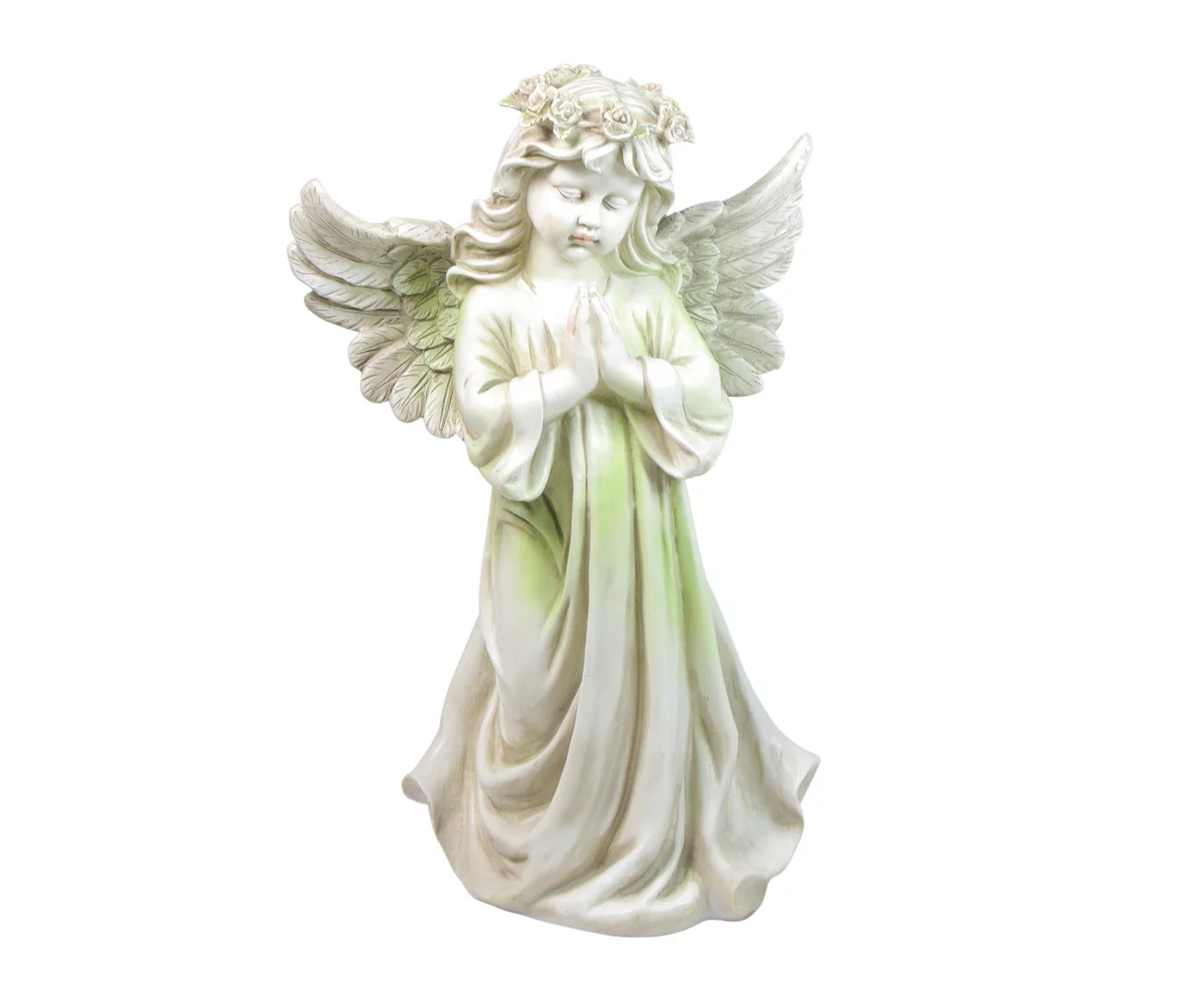 This lovely angel is a peaceful and serene addition to your yard or garden. She is kneeling in prayer with a flower crown in her hair. From her amazingly intricate wings to her softly folded gown, there is no detail missed. She will be a guardian of your yard and will add a touch of quiet, classic style to any backyard for years to come.