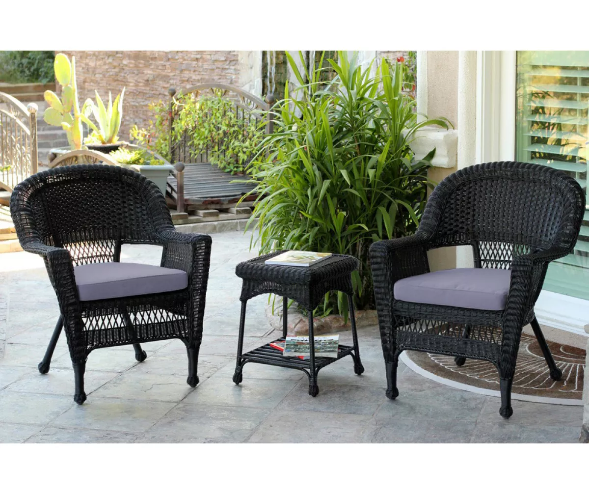 - Includes 2 – chairs with seat cushions and end table