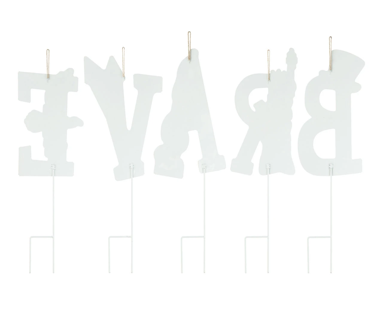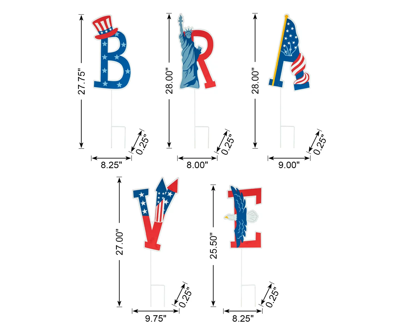 Land of the free because of the brave. This five-piece yard stake set writes out the perfect theme for your Independence Day celebrations. “Brave” is written out in oversize red, white and blue letters and accented with classic icons of the Statue of Liberty, a bald eagle, Uncle Sam’s hat, fireworks and a flag. This set can display around your yard or alternatively as wall décor on the porch.