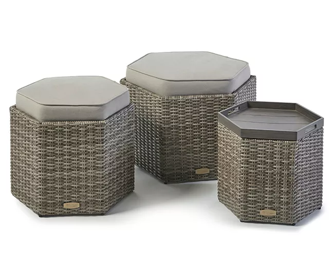 Find comfort outdoors in the striking clean lines and modern design of the Broyhill Legacy Ardendale sectional and ottoman set. Each piece features a durable, rust-resistant steel frame covered in luxurious all-weather wicker offering rich authentic color and texture. As you relax on the all-weather cushions that provide a plush, soft yet sturdy experience, the wood look tops on the stylish side tables lift to reveal storage for keeping your favorite items nearby as the hexagonal ottomans in varying heights provide a place to rest your feet on.