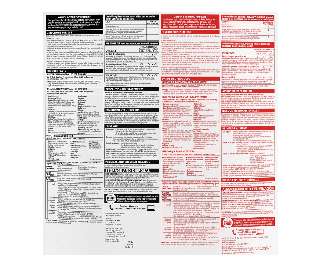 Protect your backyard and enjoy your lawn with Ortho BugClear Lawn Insect Killer1 Granules. The fast-acting insect killer starts to work in minutes (except against fire ants) and kills by contact to protect against all listed insects including ants, spiders, ticks, fleas and grubs. Use on your lawn ornamentals, home perimeter, vegetable garden and flower beds to protect against pesky insects, killing them outside before they come inside (refer to product label for complete lists). Works above and below the ground. Create a long-lasting bug barrier for up to 6-months of ant control and 3-months of residual protection against spiders, ticks, beetles and other listed insects (see product label for full list). Apply the yard bug killer early in the spring before infestation or whenever insect activity or damage is first observed. For best results, apply with a Scotts spreader and then immediately water in granules. Each 10 pound bag treats up to 16,500 sq. ft.