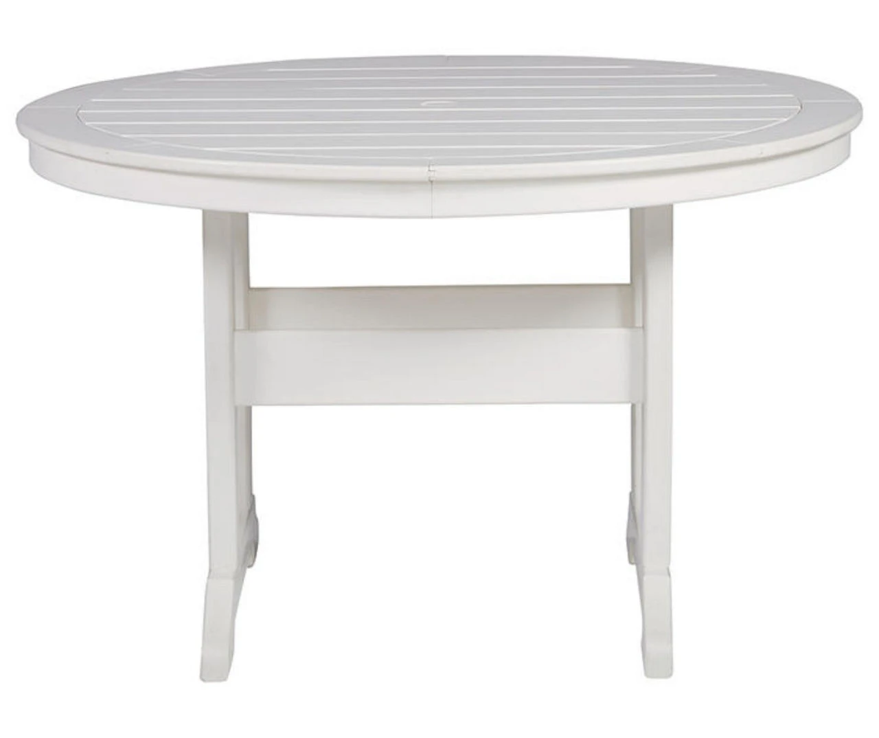 Set this table up for a backyard or poolside gathering, and serve up an extra helping of good times. Designed for easy-breezy living, this cool white outdoor dining table is made of extremely durable Mega Tuff HDPE material to withstand harsh weather elements. Stainless steel hardware and aluminum supports provide extra strength.