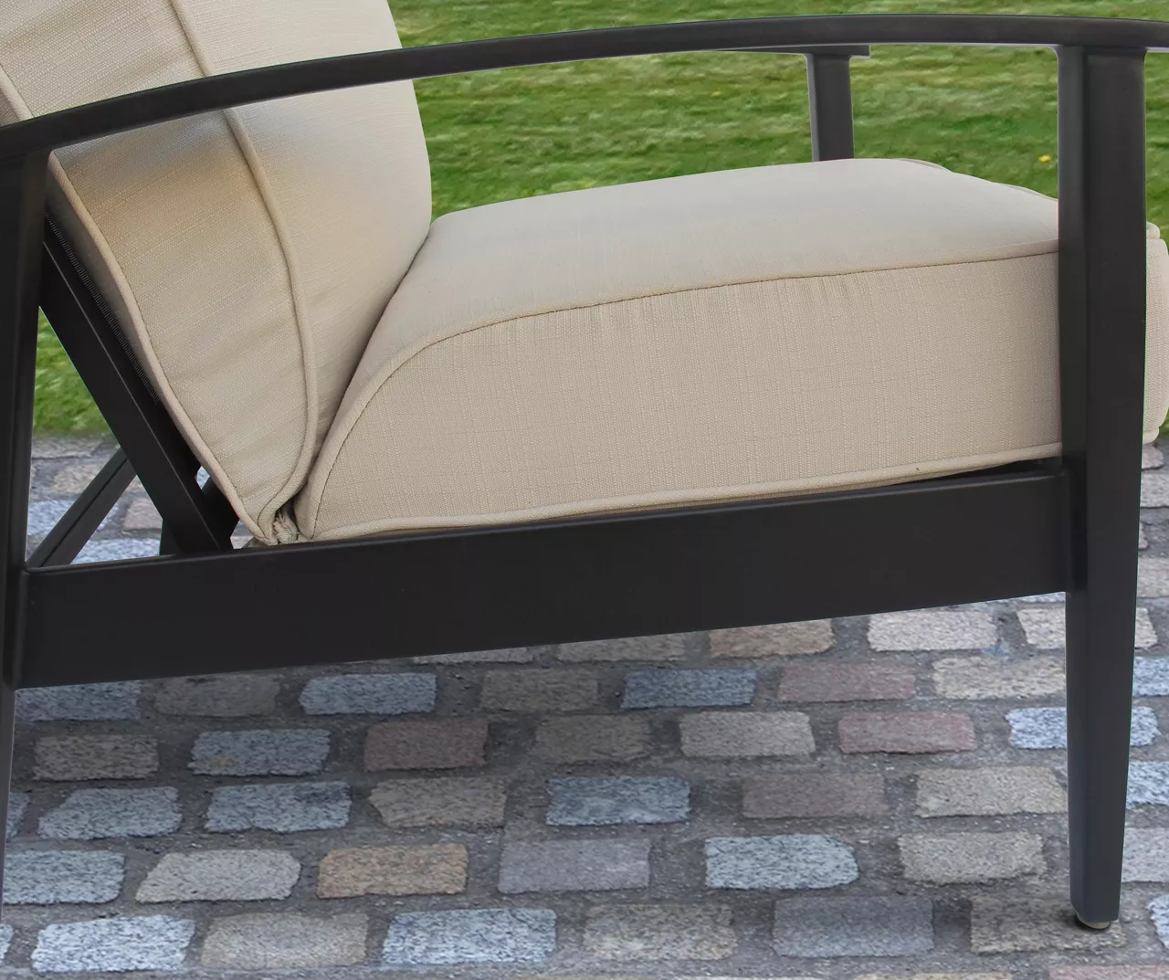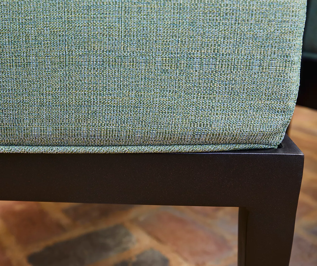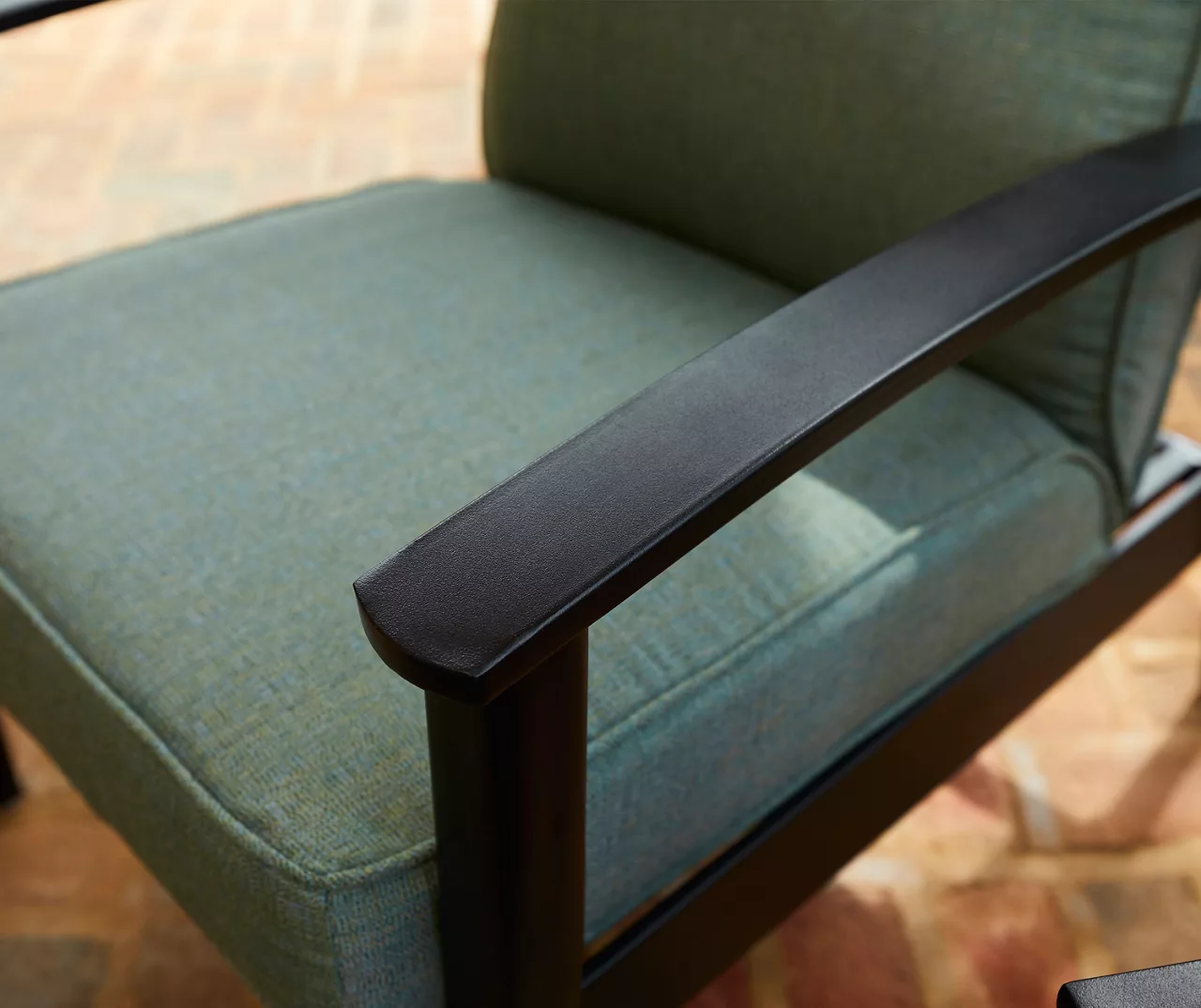 - Weather-resistant, deep seating olefin fabric cushions with plush polyester fill in sage green