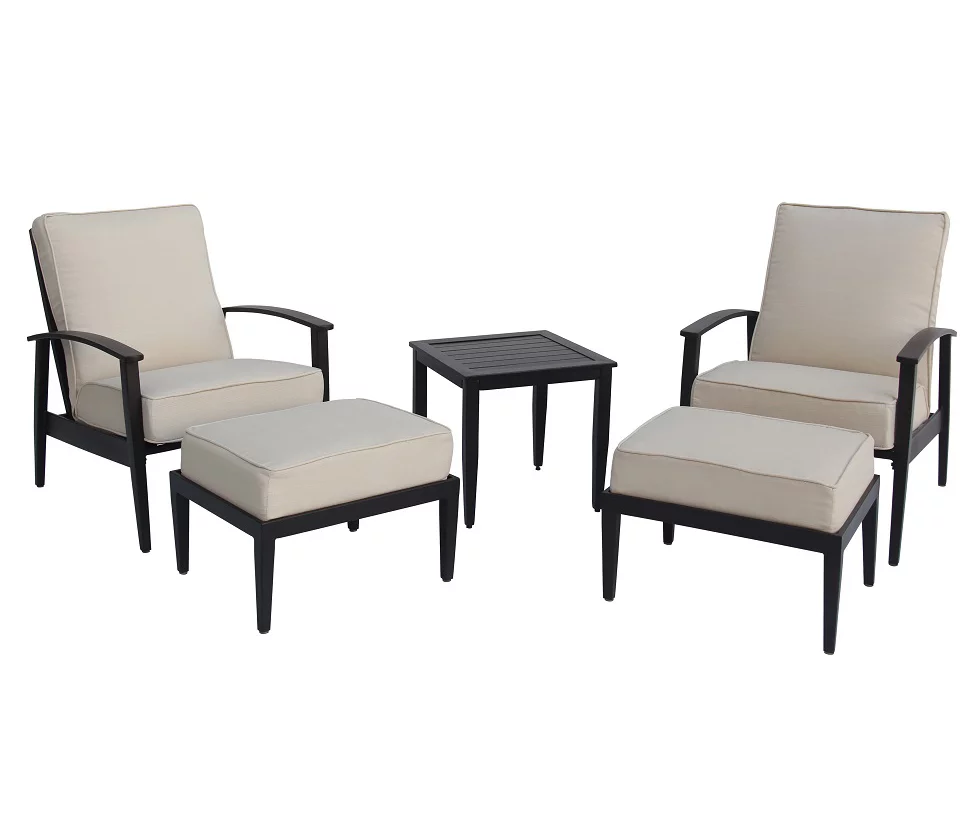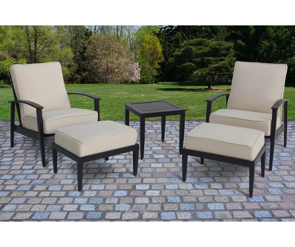 - Includes 2 outdoor chairs with cushions, 2 ottomans with cushions and side table