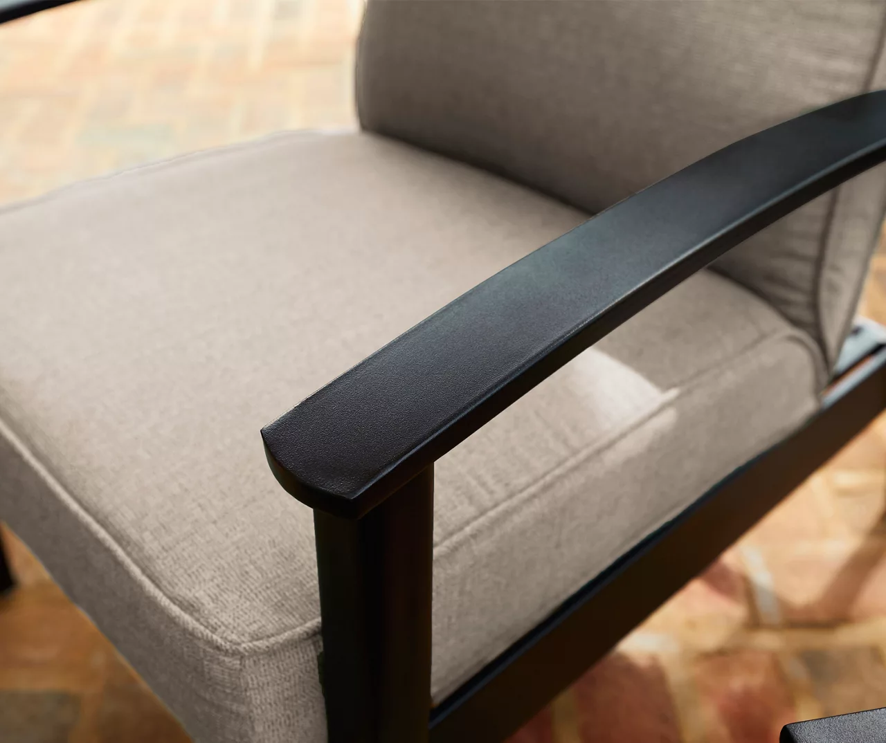Take a moment and enjoy yourself in the great outdoors on this Cypress Lake seating set. Contemporary designed powder-coated steel frames feature long curved armrests, tapering legs and are topped with luxurious, weather-resistant olefin fabric cushions in a beautiful sage green. Complete with a side table to rest drinks and accessories on, this magnificent arrangement is perfect for relaxation and conversation on a porch, patio or deck.