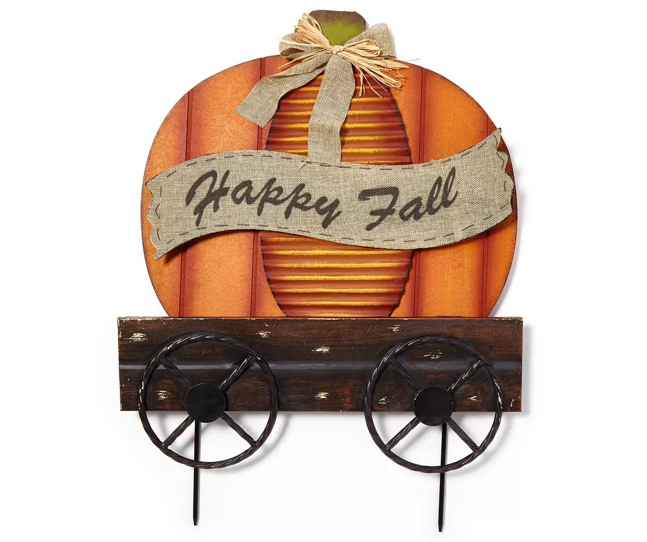 This adorable wagon-themed stake rolls its way onto your home’s lawn! Pleasantly plump with a charming pumpkin in its carriage, this yard accent features a lovely “happy fall” banner and bow. Designed with two stakes that plant into the ground, it’s perfect for featuring in your lawn or garden.