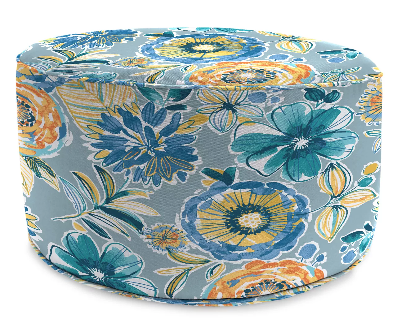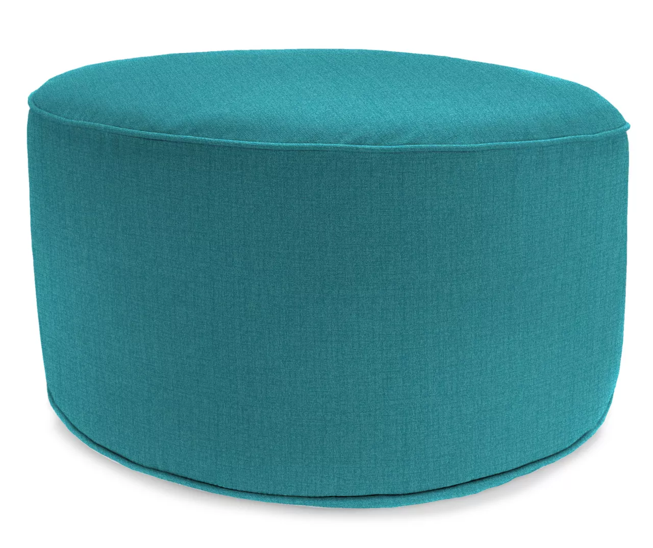 Bring lovely design to your outdoor living space using this round teal pouf ottoman. Made with spun polyester fabric for prolong use outdoors, it features a boxed edge design with matching welt trim for a tailored look. Filled with foam for added comfort, it can be used as a place to rest your feet or a comfy extra seat.