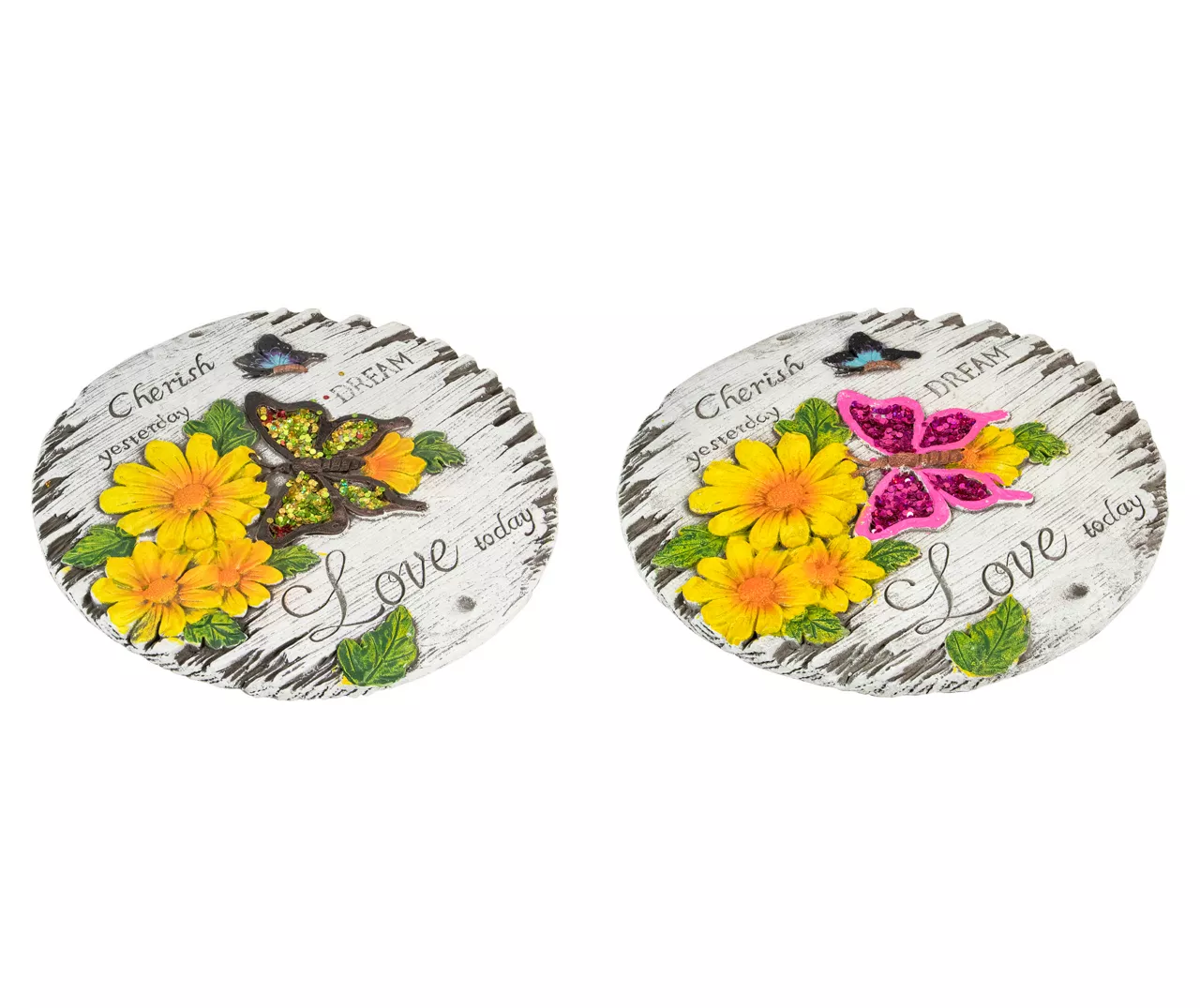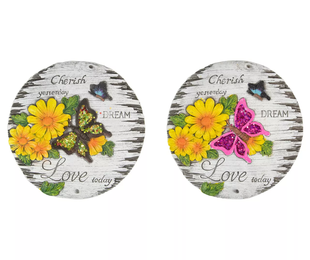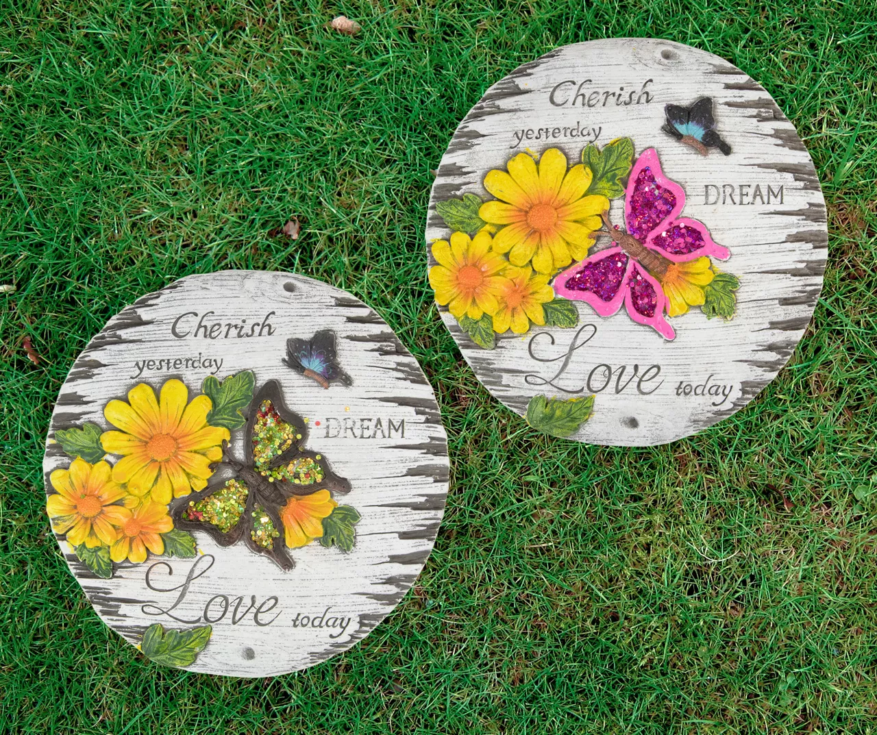 This set of garden stones will add a pop of color and welcome your guests in summer style. Each stone features flowers and a butterfly with the sentiment “Cherish Yesterday Dream Love Today”. Made from durable resin, this pair will greet your friends from season to season.