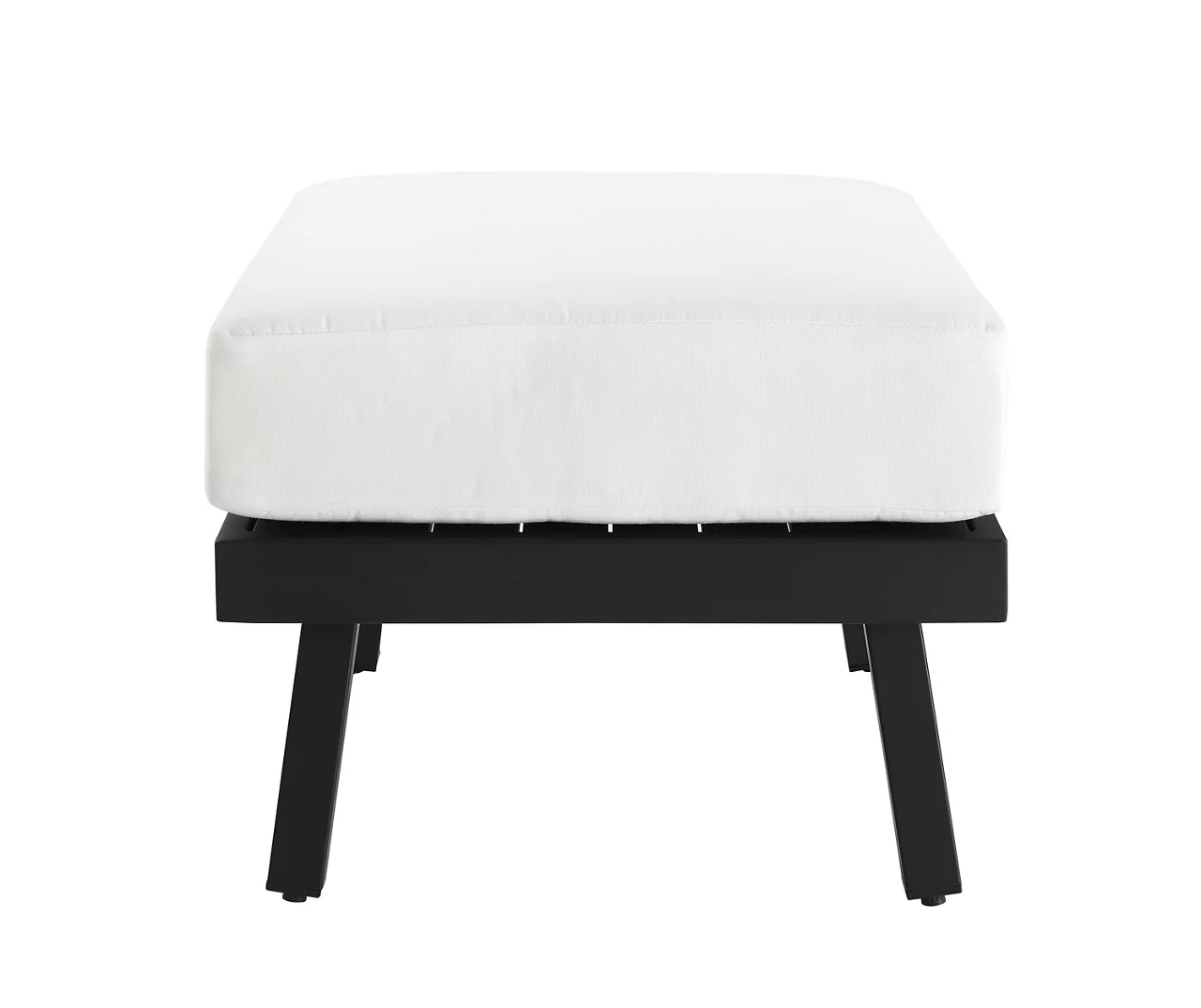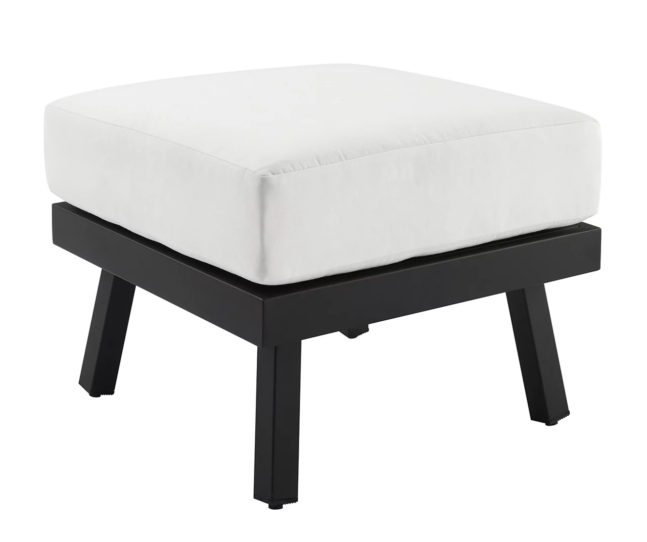 Kick up your feet and relax year round with this outdoor ottoman. Constructed of aluminum for a sturdy base that’s easy to transport, the black powder coated frame is also rust resistant. Additionally, the cushions are upholstered in white Sunbrella fabric that is fade, stain and mold resistant, so you can enjoy this piece outside for years to come.