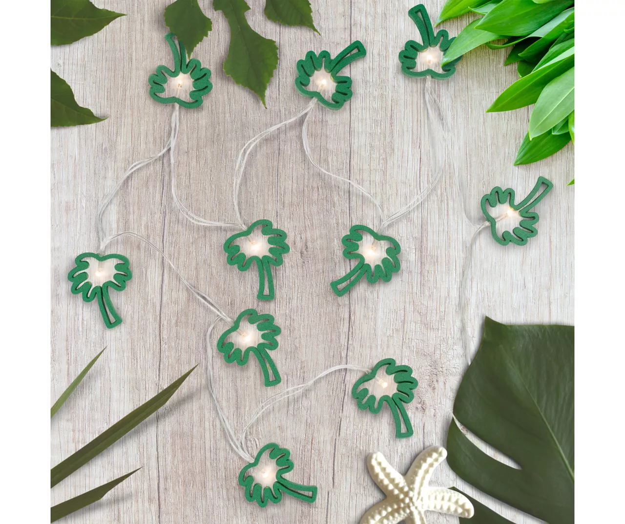 Light up your space with these adorable green palm tree-shaped lights. These battery-powered lights can hang from more places without the need of an outlet. Perfect for adding some tropical magic to a wreath, tree, garland or add to your lanterns and vases for some unique sparkle.