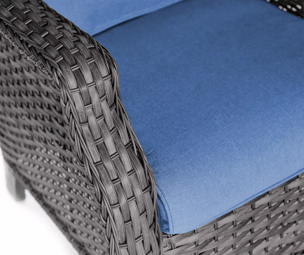 - Weather-resistant seat and back cushions in navy blue