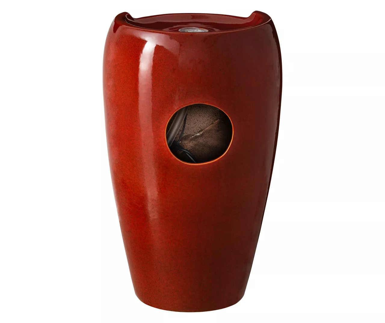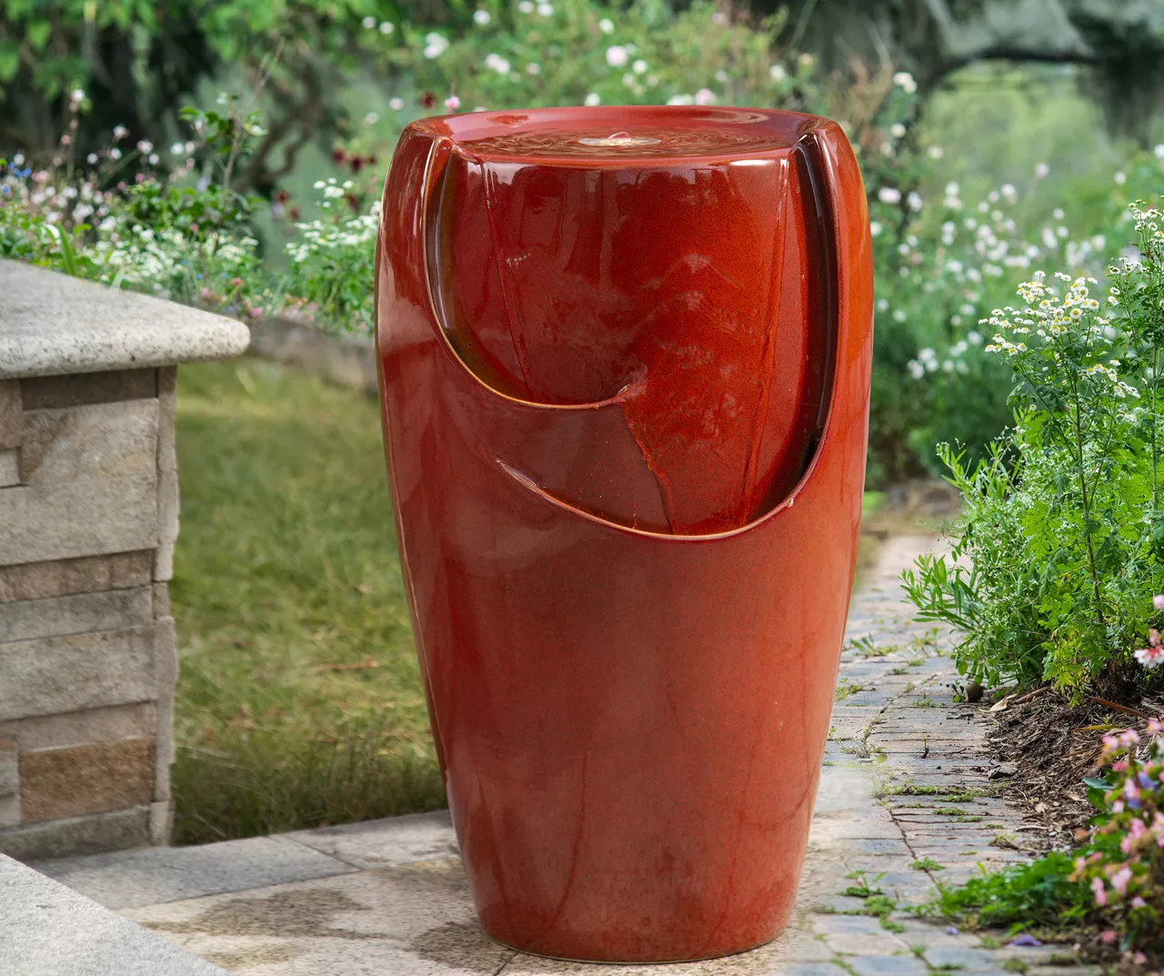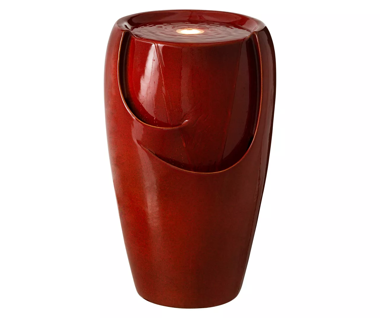 This versatile fountain brings tranquility and beauty to your indoor or outdoor space. The tall ceramic pot design features intricate carved lines as a warm white LED illuminates a stunning glow. Complete with a built-in pump for creating a soothing sound of cascading water, this fountain is a gorgeous addition to a living room, patio or garden.