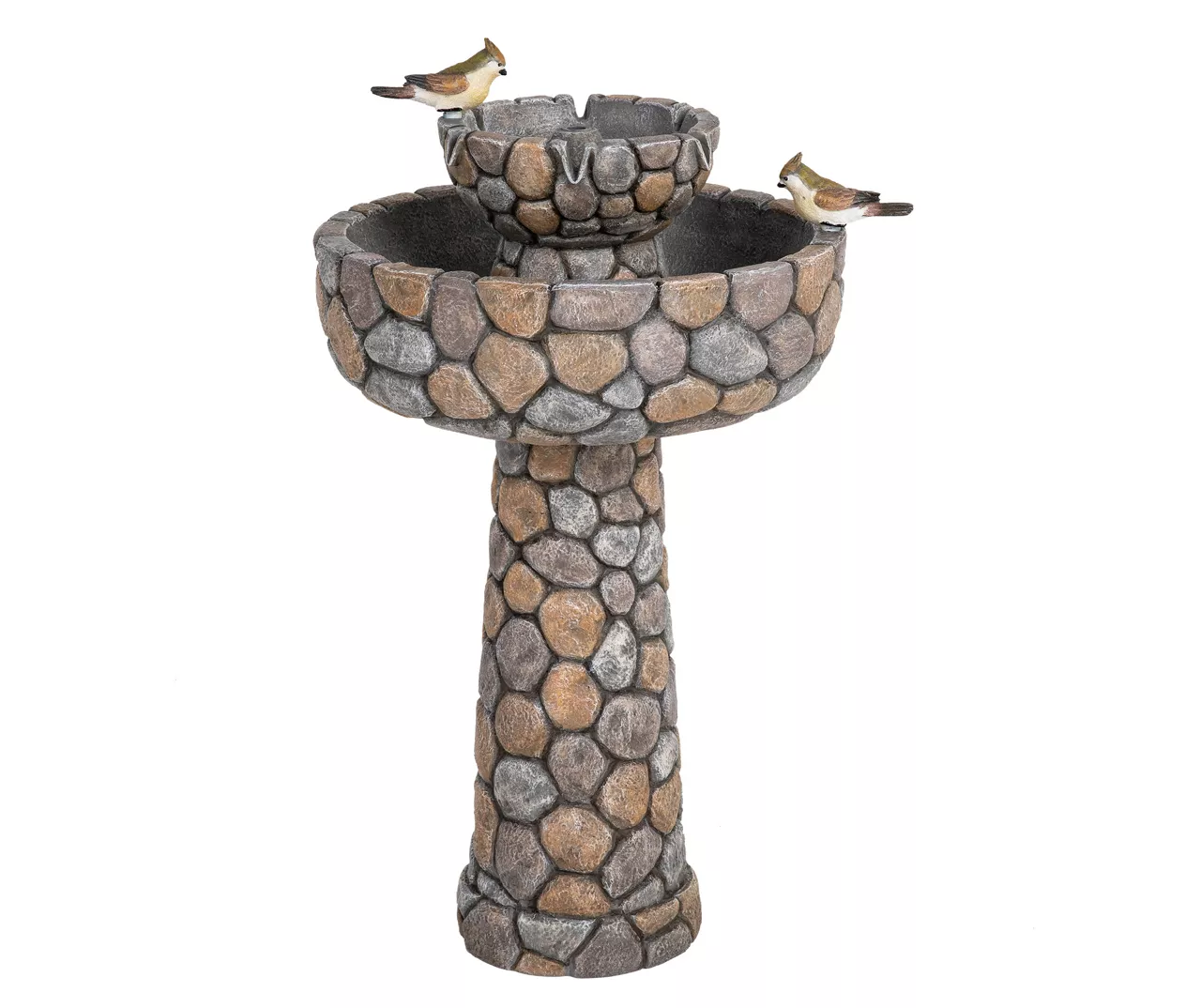 - Features 2-tier design with smooth pebble look and bird figures
