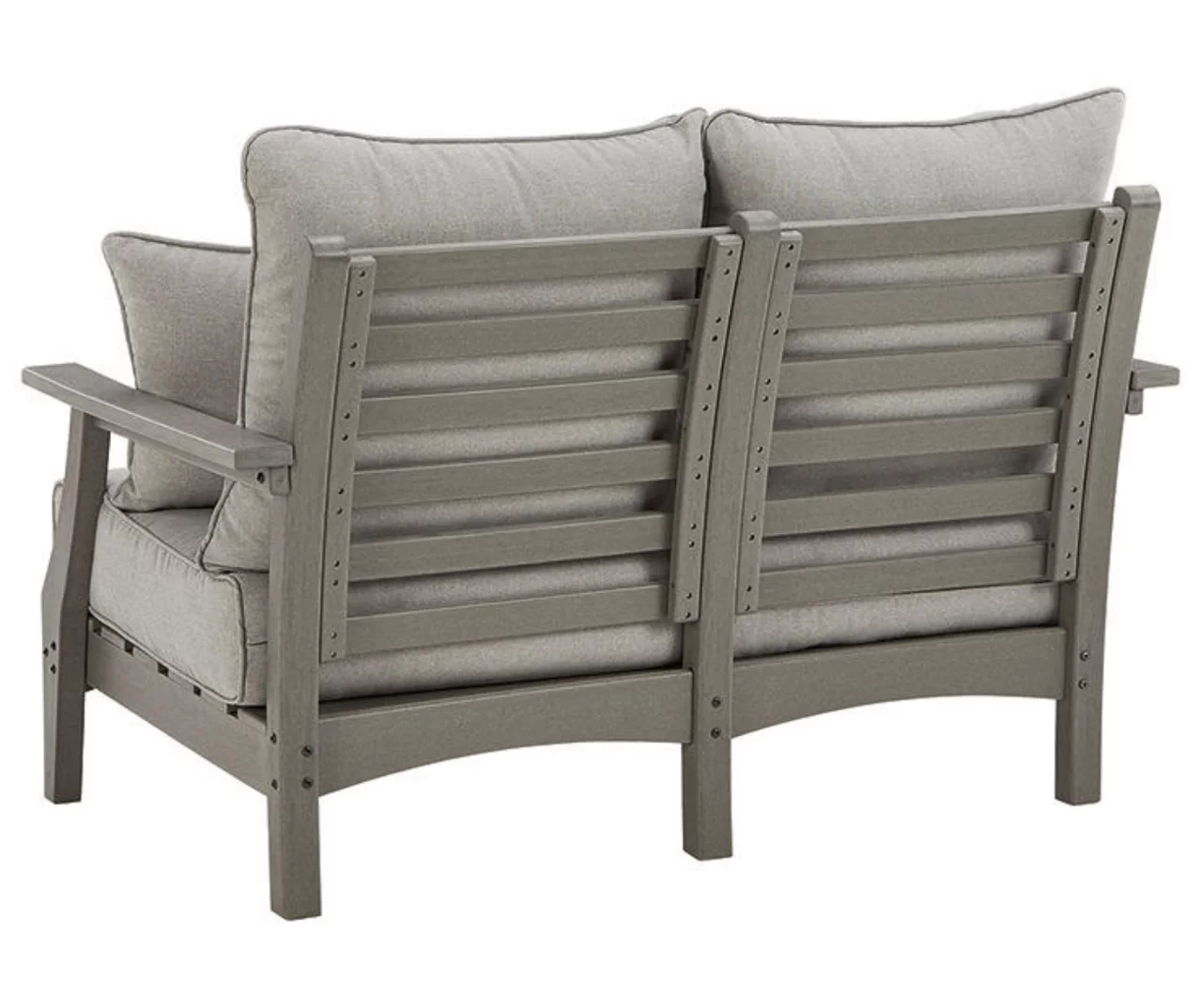 It’s the dawn of a new day for gray. Embrace the style trend with this outdoor loveseat. Crafted of HDPE material that combines the exceptional durability and weather resistance you need with the “wood look” you love, this comfortably cushioned loveseat takes outdoor living to a whole new level. Rest assured, the thick seat and back cushions and throw pillows are wrapped in exclusive Nuvella high-performance fabric that’s fade resistant, stain resistant and a breeze to clean.