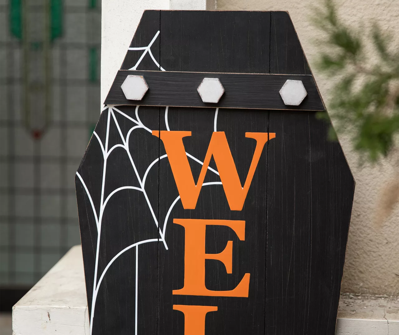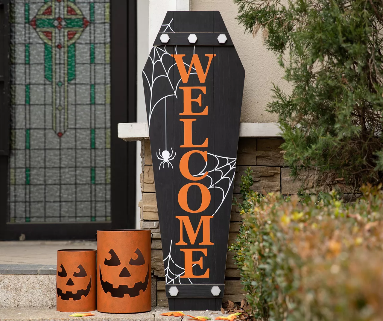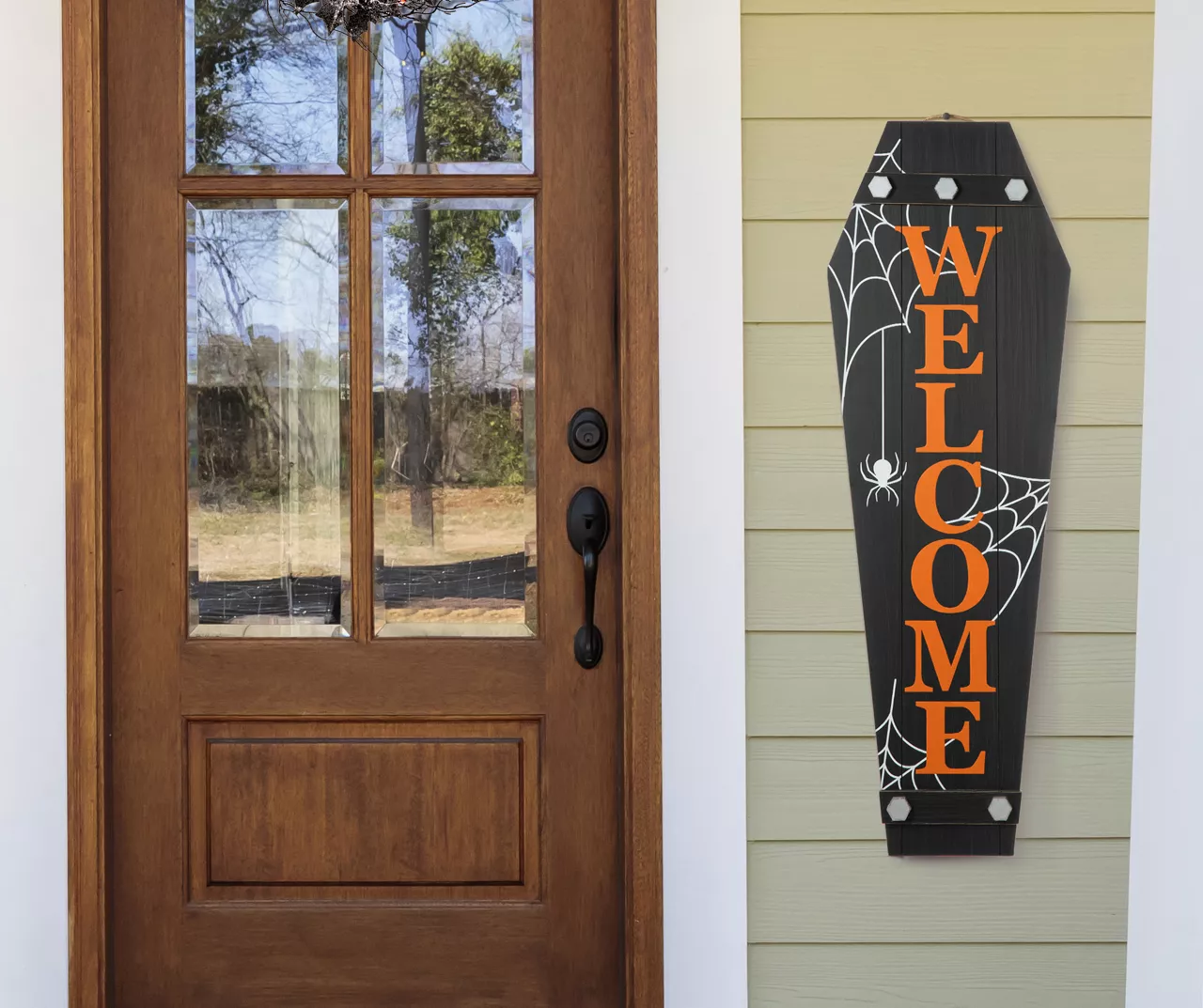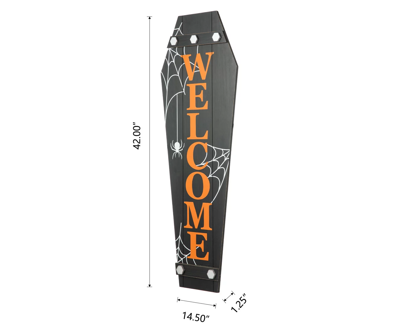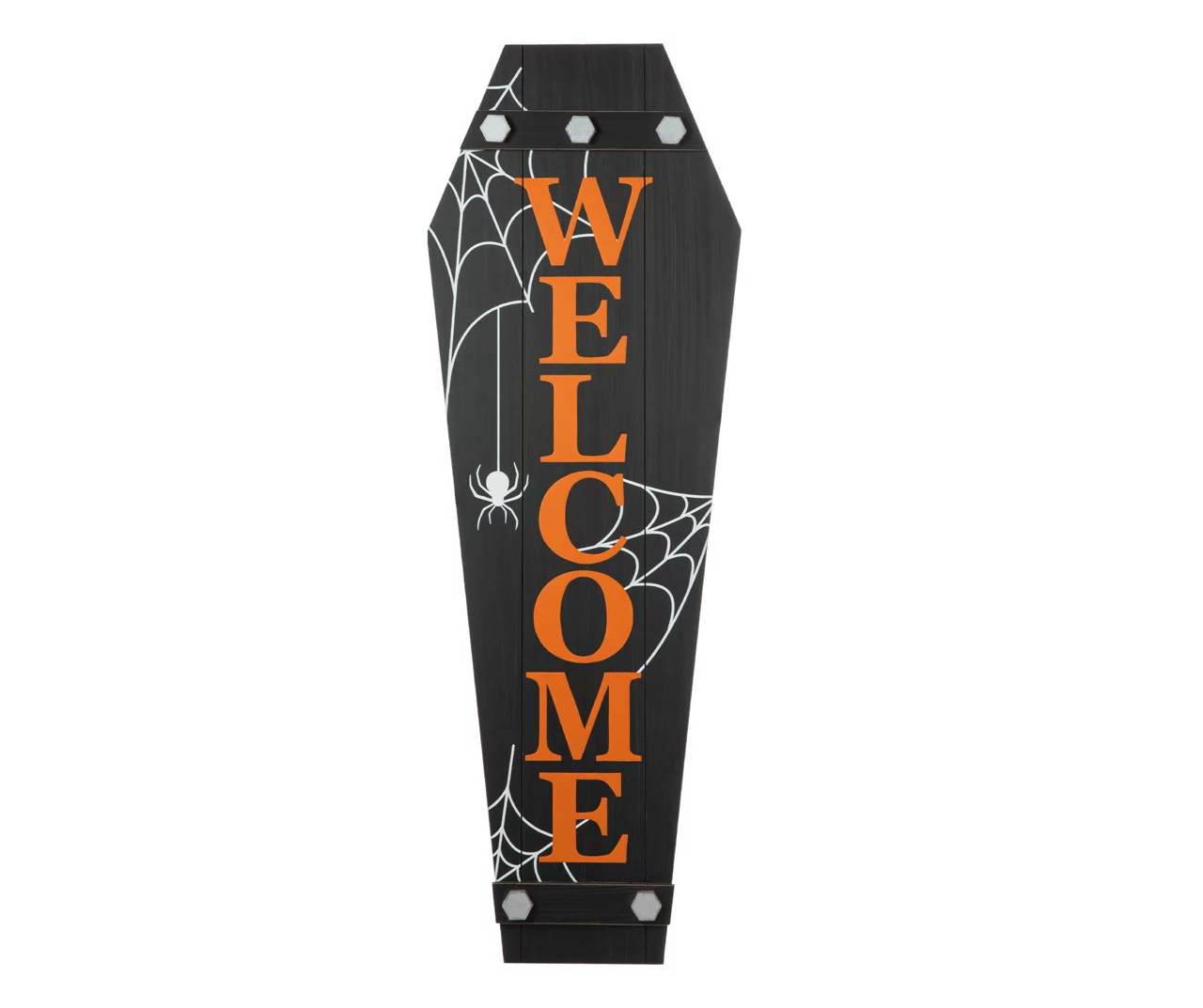 This coffin shaped sign is made with white cobweb printing and the message of “welcome” in orange letters. It will scare you in your home or office for Halloween party seasons but shows your welcome and decorate your porch in the same time.
